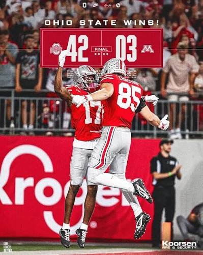 The Ohio State Buckeyes once again proved why they stand atop college football’s elite, dismantling the Minnesota Golden Gophers 42-3 in a masterclass of speed, precision, and pure dominance. At the heart of this statement victory was the electric duo of Carnell Tate and Jeremiah Smith, who combined for a jaw-dropping offensive display that left fans roaring and the Gophers’ defense gasping for answers.